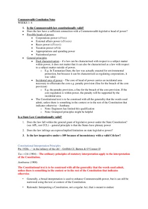 Includes: Basic constitutional interpretation principles Heads of powers: Corporation, External Affairs, Races, Taxation, Spending and Appropriation, Nationhood, Defence Limits of power: for both Commonwealth and State powers (S109, Cth and State Immunity, IFPC, S92, Express powers) Detailed notes of the whole course. Not suitable as an exam template but more for additional information to ctrl f if needed during the take home exams.