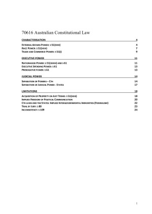 Easy to navigate. Legislation and common law coloured. Each section includes answer scaffolds so you can focus on identifying issues in the exam and application is easy. Topics: Characterisation: external affairs power, race power, and trade and commerce power; executive power: nationhood power, executive spending power, and prerogative power; judicial power: separation of powers (Cth) and separation of judicial power (states); limitations: acquisition of property on just terms, implied freedom of political communication, commonwealth laws and the states (federalism), trial by jury, and inconsistency.