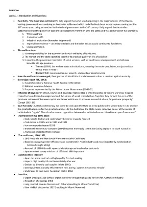 Notes include weeks 1-12 lectures and include notes from the assigned readings + textbook. Tutorial material is included where appropriate. Topics: Week 1 – Introduction and Overview Week 2 – Convict Foundations Week 3 – Pastoral Expansion and Retreat Week 4 – Boom and Bust, Week 5 – From Great War to Depression, Week 6 – World War Two and Its Economic Legacy Week 7 – The Long Boom, Week 8 – The End of the Long Boom, Week 9 – The 1980s Week 10 – The 1990s Week 11 – The China Boom and the Global Financial Crisis Week 12 – The Long Run and Now: Revision and Overview