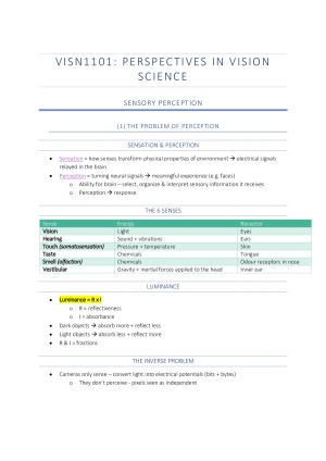 ACHIEVED HD MARK OF 89 Summary of Dr. Juno Kim's portion of the VISN1101 course - thoughtfully put together with images and colour-coding for ease of study. Notes are concise, including definitions as well as extra explanations not already on the lecture slides. These notes cover the 5 lectures presented by Dr. Juno Kim over the course of 5 hours in total and are therefore not complete notes for the entire course. Topics include: 1. The problem of perception 2. Overview of visual pathways & processes 3. Eye movements & the perception of form & motion 4. Sound & hearing 5. Sense of taste