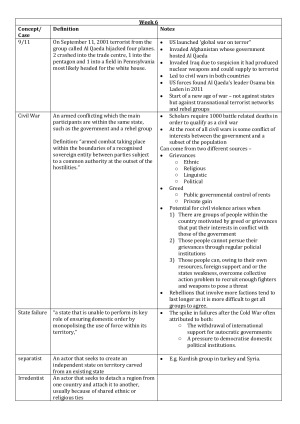 Separated into weeks, each topic has a detailed definition and further explanation or real-life example. Topics in notes: 9/11 Civil War State failure separatist Irredentist Proxy wars Insurgency Asymmetric warfare Terrorism extremists coercion provocation Spoiling outbidding International/foreign Trade Comparative advantage Absolute advantage Heckscher-Ohlin trade theory Protectionism Trade barriers Tariff Quantitative restriction (quota) Nontariff barriers to trade Stolper-Samuelson theorem Ricardo-Viner (specific factors) model Reciprocity World Trade Organisation General Agreement on Tariffs and Trade (GATT) Regional trade agreements (RTAs) Portfolio investment Sovereign lending Foreign direct investment (FDI) World bank Recession Depression Default Austerity International Monetary Fund (IMF) Multinational corporation (MNC) Bilateral investment treaty Less developed countries (LCDs) Infrastructure Primary products Terms of trade Import-substituting industrialisation (ISI) Export oriented industrialisation (EOI) Washington consensus Commodity cartels Economic development Resource curse Developed countries VS poorer countries International law Customary international law Obligation Precision Delegation Norms Norms entrepreneurs Transnational advocacy network (TAN) Norms life cycle Boomerang model International organisation Human Rights Universal Declaration of Human Rights (UDHR) International Covenant on Civil and Political Rights (ICCPR) International Bill of Rights Nonderogable Rights Individual petition International criminal court Human rights conventions Migration Refugees Ozone layer Global climate change Cap-and-trade Vienna convention Montreal Protocol Collective action problem How do we explain change in the international system? Weapons of mass destruction Nuclear Weapons China US Relations Economic globalisation Global governance