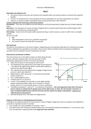 Topics separated into weeks, each with definition and some with a detailed explanation of graphs (marked 'with graph') - information from lectures and textbook. Topics: Rationality and attitude to risk Risk Neutral Risk Averse Risk Seeking Risk Continued Risk Aversion and Decision to Offend (with graph) Response of Risk Averse to Changing Expected Sanctions (with graph) Risk Seeking and Decision to Offend (with graph) Response to Risk Seekers to Changing Sanctions (with graph) Freeman, Grogger and Sonstelie (1996) note Neighbourhood Crime Model (with graph) As the number of offenders in an area increases, the probability of conviction decreases – why? (with graph) Neighbourhood Crime Model – Different Levels of Police effort (with graph) Effects of a neighbourhood street gang (with graph) The Self-Enforcement Model (with graph) The Self-Enforcement Model With Temporary Police Action (with graph) Cooperative equilibrium Dominant strategy equilibrium Nash equilibrium Pure v/s Mixed Strategies A Nash equilibrium in pure strategies A Nash equilibrium in mixed strategies How to solve mixed strategies- driver/ police example Statistical Problems in Testing Determinants of Crime Rates Testing the economics of crime model: Errors in Variable Bias Omitted variables Bias Simultaneous equation bias Instrumental variables Incarceration Separating the Effects of Time Spent in Prison on Crime Simultaneous Equation Bias Natural Experiments ‘ Direct Testing for Incapacitation Effects on Crime - Problems with this Equation Why does juvenile crime need special attention? Deterrence and the supply of juvenile crime Neighbourhood location and crime Problems with study Broken windows hypothesis Market for drugs with sanctions on dealers and users (with graph) Economic behind criminalizing a psychoactive substance Using the market for crime model to analyze taxation versus criminalization (with graph) Benefit/cost analysis of the choice of taxation versus criminalization (with graph) - 2 examples