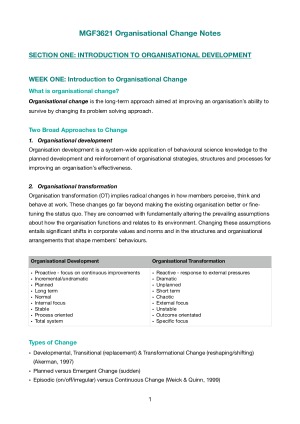 Includes notes on weeks 1-11 Builds on and extends the lecture content Topics include: - Introduction & Overview - Approaches to Planned Change & Sustainable Organisational Change - Metaphors & Organisational Change - Consultant-Client Relationships - Organisational Diagnosis - Action Research - Organisational Interventions - Organisational Learning - Resistance to Change - Evaluation and Institutionalisation - Transformation and Culture Change - Change and Management - Reflection, Reframing, Revision
