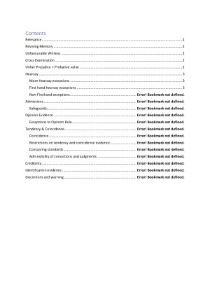 Includes 12 weeks of lectures and readings. Includes relevance, reviving memory, unfavorable witness, cross examination, unfair prejudice + probative value, hearsay, admissions, opinion evidence, tendency + coincidence, credibility, ID evidence and discretions and warning
