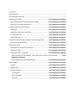 Covers lectures and readings from week 1 to week 6 Has state immunity, commonwealth immunity, defence power, implied freedom of communication, freedom of interstate trade, inconsistency, express rights