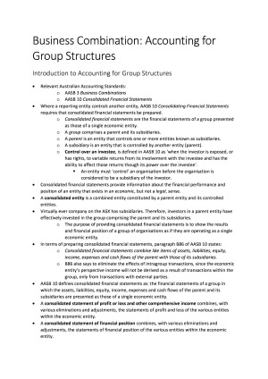 These notes are a comprehensive summary of AFM305 compiled from lectures, lecture notes, and textbook readings. I received an Distinction in this unit with a mark of 81, and these notes helped me a lot. These notes mainly cover the theory component of this unit, as the practical part is covered thoroughly in the weekly online Zoom sessions with examples and solutions given. These notes will be extremely beneficial for the final exam, which, like the rest of this unit, is an extremely difficult accounting subject. The topics covered in these notes are: Topic 1- Business Combinations: Accounting for Group Structures Topic 2 - Consolidation Accounting: Accounting for Acquisitions of Subsidiaries Topic 3 - Consolidation Accounting: Accounting for Intra-Group Transactions and Unrealised Profits Topic 4 - Consolidation Accounting: Accounting for Non-Controlling Interests Topic 5 - Equity Investment: Accounting for Associated Entities Topic 6 - Equity Investment: Accounting for Joint Arrangements Topic 7 - Concepts of Corporate Governance and Corporate Social Responsibility Topic 8 - Accounting for Operating Segments and Construction Contracts Topic 9 - Accounting for Foreign Currency Transactions & Translations of Foreign Operations Topic 10 - Accounting for Financial Instruments