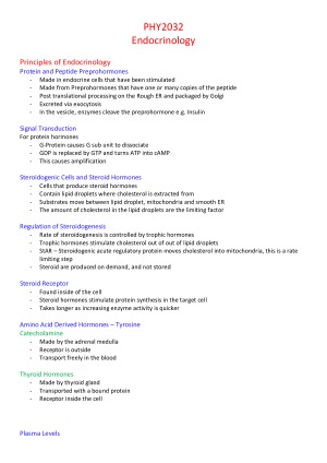 My notes are a comprehensive combination of both lecture content and practicals, allowing me to get a HD for the subject. With hard work and these notes, you can too! The notes were created throughout the semester and are in-depth and thorough, with diagrams to aid and consolidate your knowledge. Being created throughout the semester, these notes are not rushed and very detailed. All 23 lectures are covered in tremendous detail with the 4 major themes included being - Endocrine Systems (Pancreas, Diabetes, HPA Axis, Adrenal, Stress, Thyroid, Parathyroid, Growth) - Reproductive System/Fertilisation - Digestive System - Metabolism The notes are designed with each new lecture having a title coloured in red. The titles in blue are sub-topics within that lecture.