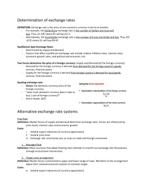 A complete and concise summary of all examinable topics for finals. Organized for quick reading and also good for comprehensive memorizing. All formulas, theory explanations plus appropriate graphics and charts included for further understanding. Chapters from examinable weeks summarized and covered comprehensively. Topics covered: 1) Determination of Exchange Rates 2) Alternative Exchange Rate Systems 3) International Parity Conditions 4) Country Risk Analysis 5) The Forex Market 6) Measuring and Managing Economic Exposure of Forex Risk 7) International Financing and Capital Markets 8) Financing Foreign Trade 9) Growth and Structure of International Banking