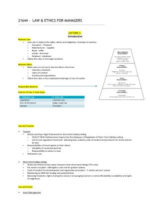 This includes all lecture notes as well as additional notes from the textbook including chapter summaries Topics covered include: 1) Introduction 2) Sources of Law & Regulation 3) Sources of Law: Legislation 4) Contracts 5) Legal Structures and Governance for Business Organisations 6) Torts: Negligence 7) Risk Management 9) Consumer Protection Law 10) Intellectual Property 11) Ethics