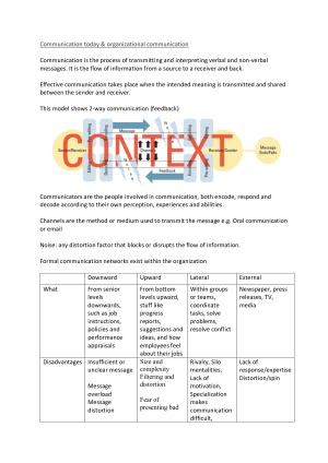 Topics covered: Communication today & organisational communication, self-disclosure, Interpersonal skills: listening, Feedback, negotiation skills, Resume and Cover Letter Skills, Groups and communicating in meetings, Conflict management, Technologically Mediated Communication (TMC) Notes are arranged on a weekly basis. Covers the weeks and topics that are tested in the exams.