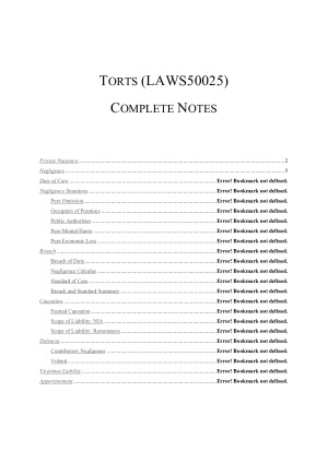 Completed Torts notes with contents, case summaries and topic summaries. Extremely neat and useable format with headings, subheadings and tables. Bulk of notes are in dot-point form. Used during semester 1 2019 for Ian Malkin's stream.