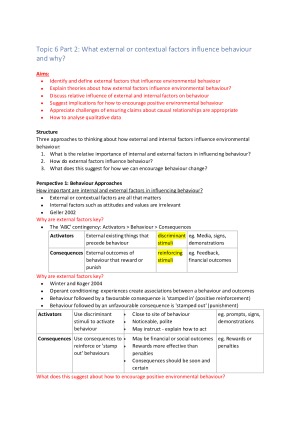 All lectures and readings included (note: no readings given for topic 9 & 10) Topic 1: what shapes human-environment relationships? Topic 2: how do humans needs/biology shape human-environment relationships? Topic 3: how do social identity and relationships shape human-environment relationships? Topic 4: how do cognitive processes shape the ways people value and respond to environments & environmental issues? Topic 5: what factors influence individual concern or attitudes towards the environment? Topic 6: what influences whether people take action on environmental issues? (split over 2 weeks/parts) Topic 7: can education and information change environmental attitudes, beliefs and behaviours? Topic 8: how do social norms influence environmental behaviour? Topic 9: designing strategies to encourage sustainable behaviour Topic 10: what shapes human-environment relationships and what does that mean for working toward a more sustainable world?