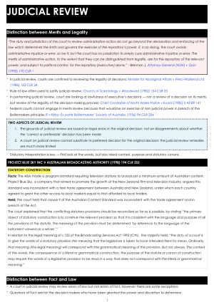 I received a HD in the assignment and in the overall subject. These notes are a compilation of lecture materials, cases, legislation, the study guide, and weekly readings. The notes cover all topics that are assessed in the exam as well as the assignment topic. Throughout the notes, there are summaries and analyses of cases, legislation, examples, and tips for the exam and assignment. I have also included very helpful Topic Summaries at the end of the notes which outline key points, themes, rules and can be used as a guideline for answering exam questions -- which are incredibly helpful for studying for the exam. TOPIC LIST: 1. Introduction to Administrative Law 2. Introduction to Judicial Review 3. Introduction to Grounds of Review & Procedural Fairness 4. Determining the Scope of the Power 5. Improper Exercise of Power 6. Consequences of Unlawful Action 7. Jurisdictional Error and Limits on Judicial Review 8. Merits Review and Administrative Review Tribunals 9. Ombudsman and Freedom of Information