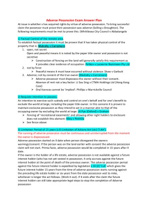 HD property law exams answer guides. These notes helped me ace my exam and are made so they are easy to follow. This is not a complete summary of all the units content, more easy guides for exam and seminar questions. Topics/Weeks Covered: Week 3- Adverse Possession 5- Native Title 6-Estates 8- Equitable Interests 9- Easements 10- Covenants 11- Mortgages Topics NOT covered: Weeks 1 & 2- Lecture slides and readings can only be done for these topics no possible answer guide given the lack of structure in the topics. Week 4- Tenure (not examinable) Week 7- Leases (lecture slides suffice)