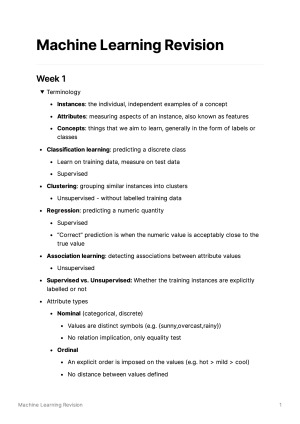 This Note for Machine Learning is used for revision purposes. It contains all lecture+tutorial topics from week 1 to week 12. Note was made using markdown and followed the course structure. Topics include: - Introduction to ML - Different types of ML algorithms - Probability Model - Naive Bayes - Classification Evaluation - Decision Tree - Instance-based Learning - Distance measurement - K nearest neighbour - Support Vector Machine - Attributes and feature selection - Discretisation - Linear regression - Logistic regression - Classifier combination (stacking, boosting, bagging etc.) - Semi-supervised learning - Interpreting models, error analysis - Evaluation - Neural networks - Deep learning - Sequential Classification - Markov chain - Forward Algorithm - Viterbi Algorithm I used this note to obtain H1 in final exam. All mathematics formula are typed using LaTeX and summarised from lectures. It was very useful and you can easily spend 1 or 2 weeks on it to achieve H1 :)