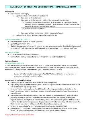 Concise and Comprehensive set of notes, covering everything you need to succeed in Public Law. Notes Include: - Refined Topic Notes structured by topic - Detailed case summaries including the facts, principles and reasoning Topics Include: - Outline of constitutional documents and their history - The constitution its structure and principles - Types of constitutions - Amendment of the commonwealth constitution - Amendment of the state constitutions – manner and form - Representation of the people in the legislature - Right to vote - Qualification and disqualification of members of parliament and disputed elections - The executive - Introduction to executive power - Nationhood power - The capacities of the executive – the powers to contract and spend - Access to government documents - Production of documents ordered by house - Rule – making accountability - Fourth arm of government – integrity bodies - The separation of powers and the meaning of judicial power - The separation of powers (continued) and its effect on federal judges and federal courts - State courts and the exercise of judicial power - Federal detention of individuals and the exercise of legislative and judicial power - Matters and standing before the courts