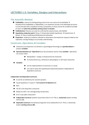 Everything you need to study to get a 7! The exam was open book when I completed this course and these notes helped me attain a 7 in one of the most difficult courses in psychology. They will also greatly assist you with assignment content :) Fully comprehensive and neatly summarised for easy access in the exam, covering the following topics: - Introduction, general definitions - Constructs, variables and relationships - IVs and research designs - Factorial designs and interactions - Design related confounds (covered in two lectures) - Procedural confounds - Confounding vs. sensitivity vs. generality - Corroborating hypotheses: construct validation and correction (covered in two lectures) - Ensuring sensitivity: control techniques Good luck!