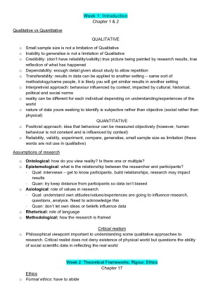 weeks 1 - 12 content included: - theoretical frameworks; ethics; rigour - interpretative phenomenology - grounded theory; ethnography - Discursive Psychology; Narratives; Unobtrusive research; Historiographies; Case Studies - Sampling; Interviews and Focus Groups - Data Analysis - ANOVA: Factorial Designs, Simple main effects - Correlation and Multiple Regression - Multivariate Statistics notes compiled based on a mixture of lecture notes, my completed assignment (I received 94%) and textbook material and well as content from tutorials. notes have been put into my own words and simplified for easy recollection :)