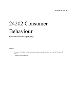 Perfect notes to prepare you for the first in-class exam AND MORE! Includes up to Week 8 of Notes, with topics: Consumer motivation, ability, opportunity, exposure, comprehension, memory, knowledge, and attitudes. Consumer decision making. Please note these are missing the last 3 weeks of content, however at the cheapest price for that reason, and contain nicely summarised information for most of the subject!
