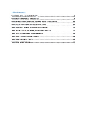 These are summary notes for each concept taught in Organisational Bevaiour which will be helpful when studying for exam. Topics covered: 1. Self and Authenticity 2. Emotional Intelligence 3. Positive psychology and work satisfaction 4. Judgement and decision making 5. Will power and work motivation 6. Social networking, power and politics 7. Group and team dynamics 8. Leadership excellence 9. Business ethics 10. Negotiation