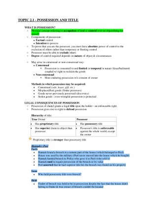 Topic 1 - What is property? Topic - New forms of property Topic - Distinction between property rights & contractual rights Topic - Fixtures Topic 2 - Possession and Title Topic 3 - Adverse possession Topic - Continuous & uninterrupted possession Topic 4 - Doctrine of Tenure Topic 5 - Native Title Topic 6 - Doctrine of Estates Topic - Contingent legal remainder rules/ Restrictions on right to alienate Topic 7 - Leases Topic 8 - Equitable property Topic 9 - Easements Topic 10 - Restrictive Covenants Topic 11 - Mortgages