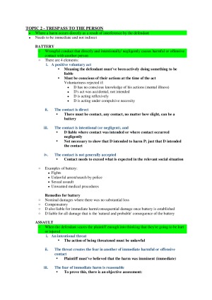 Topic 1 - Damages Topic 2 - Trespass to the person Topic 3 - Defences to intentional torts Topic 4 - Trespass to land Topic 5 - Negligence Topic 6 - Breach of duty of care Topic 7 - Causation Topic 8 - Remoteness Topic 9 - Defences to negligence Topic 10 - Vicarious liability Topic 11 - Breach of Statutory Duty