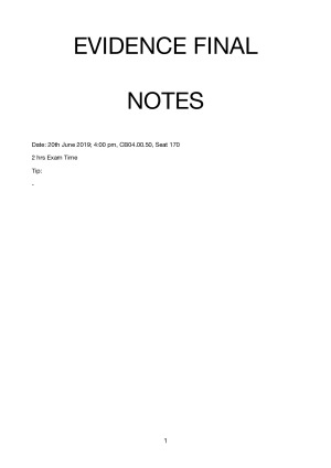 The notes are prepared to be taken into the final exam. They centre around the Evidence Act . They cover lectures, tutorial readings including textbook readings, and tutorial questions including sample answers where possible. The topics covered are: - Real Evidence and Documentary Evidence - Calling Witness, Right to Silence, and Witness Examination - Competence and Compellability - Privileges - Relevance - Exclusionary Rules (hearsay and non hearsay purpose, credibility evidence, opinion evidence, admissions, character evidence, tendency evidence and coincidence evidence) - Discretionary Rules (s 135-139) - Judicial Warnings and Directions