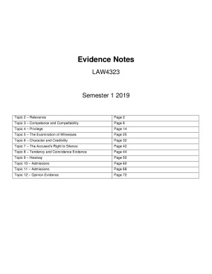 I prepared these notes for my Sem 1 2019 Evidence Exam. I spent a lot of time re-structuring them to make them as useful as possible for the exam. Evidence is a conceptually difficult subject, and I've kept quite a lot of detail in my notes which helped me to work through the concepts. They include all the topics that we studied: - Relevance - Competence and Compellability - Privilege - The Examination of Witnesses - Character and Credibility - The Accused's Right to Silence - Tendency and Coincidence - Hearsay - Admissions - Illegally Obtained Evidence - Opinion Evidence Good luck studying Evidence!