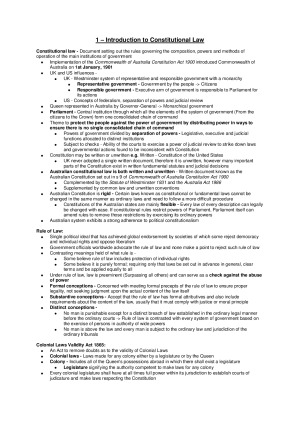 - Includes summaries of lectures and tutorials, as well as readings from Blackshield and Williams Australian Constitutional Law and Theory: Commentary and Materials (7th ed) - Comprehensive notes for ALL weeks (1-14) - ALL topics covered, including all the following: * Introduction to Constitutional Law * State legislative powers * Constitutional amendment * Separation of judicial power (Both Commonwealth and State focus areas) * The Executive * Constitutional interpretation/characterisation * Trade and commerce/incidental powers * Corporations power * External affairs power * Inconsistency * Freedom of political communication
