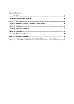 Summarised HD Management Skills HD Notes (21440) Great notes for assignments and final exam. Includes summary of weekly article readings Topics covered: Lecture 2 – Self-awareness Lecture 3 – Character Development Lecture 4 – The Brain Lecture 5 – Managing Emotions – Broaden & Build Theory Lecture 6 – Mindfulness Lecture 7 – Stress and Resilience Lecture 8 – Happiness Lecture 9 – Appreciative Inquiry Week 10 – Authentic Leadership Lecture 11 – Wellbeing, Positive Mental Health and Compassion in the Workplace