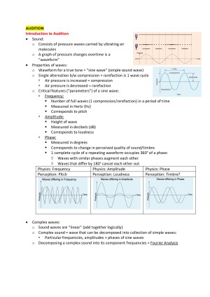 Grade: HD (85) Highly organised, detailed and simplified notes from Session 1, 2019. This subject is very content content and as a result, highly challenging. However, these "mass summary notes" are SUPER helpful for both the mid-sem & final exam. They cover all the relevant content/detail from the lectures & all the readings, but are simplified in a way that makes studying for PSY247 easier! Topics covered: -Introduction & General Principles (Week 1) -Audition (Week 2/3) -Body Senses (Week 3/4) -Chemical Senses (Week 4) -Light, Eye & Brain (Week 5) -Spatial Vision (Week 6) -Colour Vision (Week 7) -Motion Perception (Week 8) -Depth Perception (Week 9) -Visual Development (Week 10) -Object Perception (Week 11) -Multi-sensory Processing (Week 11) -Face Perception (Week 12)