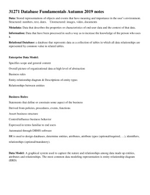Notes derived from lectures, tutorials and textbook. summarised by topic. Perfect for study, exam revision and use as exam notes. Topics included: DBMS and Data Modelling I Data Modelling II Data Modelling III Relational Model Normalization I Normalization II SQL Basics