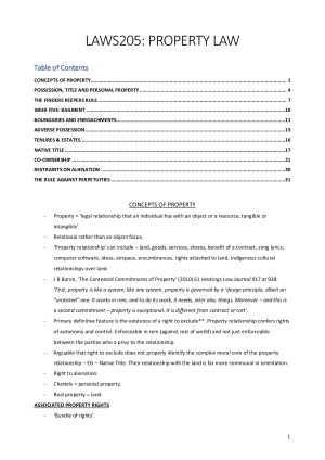 Notes based on textbook, cases and lectures. Also extra reading. Topic covered include: possessory title, finders keepers, bailment, native title, rule against perpetuities, tenures & estates, co-ownership, restraints on alienation, boundaries & encroachments, and more.