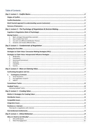 This is a comprehensive guide covering all topics in Conflict & Negotiation. It includes: - definitions & explanations - examples linked to in-class case studies - theory frameworks, outlines, and explanations All in an easy-to-read format with a table of contents to easily locate specific sections of notes on demand