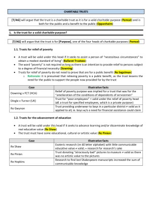 These notes were formulated for use in the Trusts exam (which is open-book). The notes are detailed, with all of the relevant ideas and case examples for each topic. They were a useful reference in my exam, as they are constructed with answering problem questions in mind. Using these notes, I received a High Distinction (88). TOPICS COVERED: – Creation of an express trust (the three certainties, formalities and constitution) – Quistclose trusts – Charitable trusts – Trustees' duties and defences to those duties – Exercise of trustees' powers – Trustees' rights – Beneficiaries' rights – Remedies for a breach of trust The sample looks at how to approach a charitable trusts question