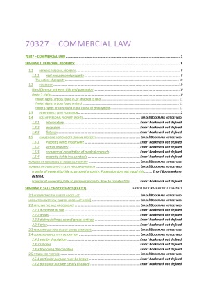 These extensive notes include information taken from seminars, various textbooks, authoritative cases, prescribed readings and further online research compiled into an easily read format. They contain relevant theoretical content, supported by vital, authoritative cases and examples to further your grasp of various content. I consistently achieved Ds and HDs throughout the semester with these notes. These notes can aid you to easily achieve your desired mark - with 115 thoroughly compiled pages, no topic is ignored! Topics: - Personal Property - Sale of Goods Act - Transfer of Property - Australian Consumer Law - Unconscionable Conduct - Unfair Contract Terms - Statutory Consumer Guarantees - Product Liability - Finance and Personal Property - Bailment - Personal Property Securities Act - International Aspects of Commercial Law