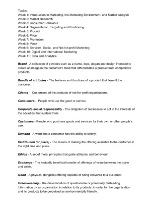 A list of definitions from lectures and textbook covering all topics. Topics: Week 1: Introduction to Marketing, the Marketing Environment, and Market Analysis Week 2: Market Research Week 3: Consumer Behaviour Week 4: Segmentation, Targeting and Positioning Week 5: Product Week 6: Price Week 7: Promotion Week 8: Place Week 9: Services, Social, and Not-for-profit Marketing Week 10: Digital and International Marketing Week 11: Data and Analytics Enjoy :)