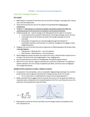 Comprehensive and well-organised note based on lectures, tutorials and textbook. It covers content from weeks 8-13, in preparation for the final exam. Final exam requires in-depth understanding of the theoretical aspect as well as the calculation aspect. My notes include detailed description of the theoretical content from the textbook and thorough research work. I have also included step-by-step calculations for each type of calculation required. Received a Distinction grade for the overall course mark. The contents of the notes are as follows (content from mid-semester exam to final exam): - Wk 8 & 9: Managing FX Exposure - Wk 10: Measuring and Managing Real Exchange Risk - Wk 11: International Debt and Equity Financing - Wk 12: International Capital Market Equilibrium - Wk 13: Political and Country Risk Analysis