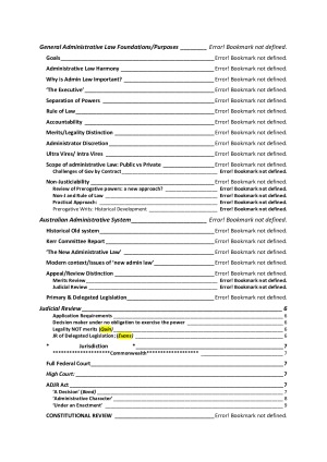 These notes cover all topics within Administrative Law. It includes extensive summaries of all cases studied within the subject. This was one of my best performing subjects at ANU. It was also a subject that I was the most engaged with, reading and summarising every piece of caselaw, legislation and assigned readings. These notes are the final polished product of my ongoing and in-depth engagement with the subject. They are my best law notes, and will assist anyone needing extensive examination notes for Admin Law.