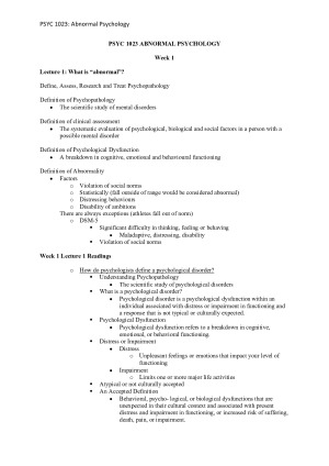 9 Weeks of Lecture Notes Week 1: What is abnormal. Psychological Disorders Week 2: James-Lange Theory of Emotion Week 3: Mood Disorders Week 4: Anxiety DIsorders Week 5: Schizophrenia Week 6: Substance Use and Abuse Week 7: Developmental Disorders (Autism, ODD and Conduct Disorder) Week 8: Personality Disorders Week 9: Cognitive Disorders