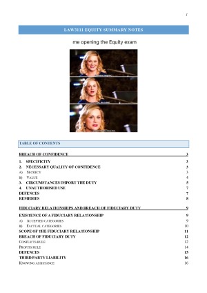 Detailed and comprehensive notes for Equity. All topics are covered, including breach of confidence, breach of fiduciary duty, personal & proprietary remedies and the assignment of property rights in equity. These notes provide an in-depth overview of the course and are structured to be perfect for exams. References to cases and legislation are colour-coded for ease of reference, red flags to look for in problem questions are highlighted, and a suggested script is included.