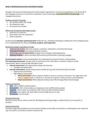 Summarized notes of Week 1 till Week 5. Week 1: Marketing Week 2: Marketing, Environment and Market Analysis Week 3: Market Research Week 4: Consumer Behavior Week 5: Business Buying Behavior