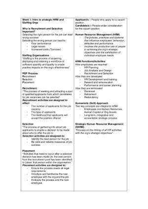 Topics Covered - Intro to Strategic HRM & Staffing Organisation - Staffing Models & Legal Compliance - HR Planning - Job Analysis - Recruitment: Attraction - Recruitment: Methods - Selection: Measurement & Shortlisting - Selection: Methods - Decision Making & Final Match - Staffing Administration - Retention Management 11 Weeks of content included, w/o tutorial content. Topics are out of order (formatted) but nothing major. Rise above you classmates without even taking down a single note by utilising these! They won't believe how good you are, all yours for the low low price of $29 sounds like a great deal!!!