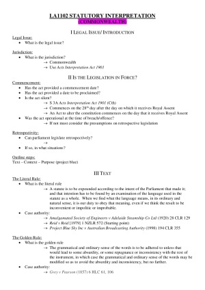 Notes include a template for statutory interpretation of Queensland and Commonwealth legislation. It includes whether the legislation is in force, textual interpretation, contextual interpretation, purposive approach to interpretation, specific considerations and common law presumptions.