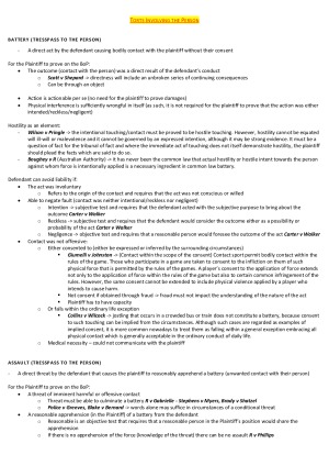These notes include the elements of actions in torts involving the person (battery, assault, false imprisonment, intentional infliction of harm, defamation), torts involving goods (trespass to goods, conversion, detinue), torts involving animals (scienter), torts involving land (trespass to land, nuisance) and the tort of privacy. It also includes the relevant defences for each action.
