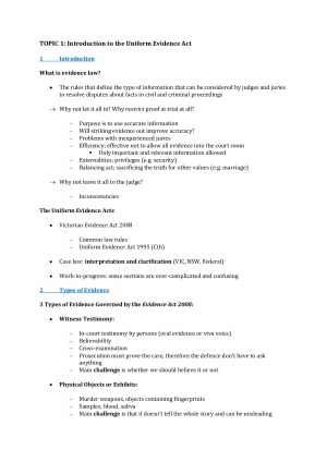 These notes were all I used in the Evidence Law exam in T2 2017 to achieve a HD. They comprise notes from the: - Lectures - Textbook - Extra readings - Cases and legislation They have everything you need to know for the exam, and all of the key principles are highlighted. The thorough, yet clear and concise, case summaries from my reading of all of the prescribed cases will save you a lot of time throughout the semester. My notes include ALL topics taught in T2 2017, including: 1. Introduction to the Uniform Evidence Act 2. Verbal Evidence 3. Documents and other Evidence 4. Relevance 5. Hearsay 6. Admissions 7. Opinion Evidence 8. Tendency and Coincidence Evidence 9. Credibility and Character Evidence 10. Privileges 11. Mandatory and Discretionary Exclusions