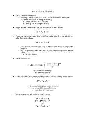 HI! These are my FINC2011 notes which are super comprehensive and really helped me study for my final exam! I hope it helps you out too :) Topics covered: Week 1: Introduction Week 2: A Modern Financial System Week 3: Financial Mathematics Week 4: Valuation of Stocks and Bonds Week 5: Capital Budgeting 1: Basic Techniques Week 6: Capital Budgeting – Further Issues Week 7: Risk and Return Week 8: Capital Asset Pricing Model Week 9: Company Cost of Capital Week 10: Equity Capital Markets Week 11: Efficient Markets and Behavioural Finance