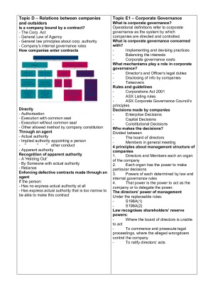 Topics Covered: - Relations between Companies and Outsiders - Corporate Governance - Company Directors and Other Officers and Directors Duties - Director's Duties - Loyalty and Good Faith - Director's Duties - Care and Diligence - Consequences - Member's Rights and Remedies - Corporate Finance - Financial Reporting and Auditing - External Administration Full rundown from the course content, dot points for easy memorisation for the exam. ALL for the low price of $29!