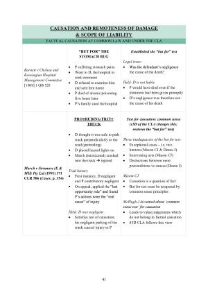 Includes concise case summaries of all cases in the course (including starred and non-starred cases). Each summary includes: fact summary; legal issues; ratio; principle Notes also include a breakdown of all relevant statute. Topics: TRESPASS Scope of tort law Historical Background Trespass to the Person False Imprisonment Action on the case for wilful injury NEGLIGENCE - DUTY Concept of a duty of care Public policy considerations negativing a duty of care Established categories of duty Duties to rescuers Difficult categories of duty Duties to third parties Duties re: psychiatric injury NEGLIGENCE - BREACH Standard of care Balancing considerations Objective standard and personal characteristics of the defendant Issues with a higher standard of care Temporal considerations Obvious risks and voluntary activities NEGLIGENCE CAUSATION Factual causation Scope of liability Intervening acts Failure to warn cases Impact of supervening and unrelated injury/illness NEGLIGENCE DEFENCES Voluntary assumption of risk Recreational activities Contributory negligence Plaintiff's unlawful conduct Intoxication ASSESSMENT OF DAMAGES FOR PERSONAL INJURY General damages Gratuitous services Possibilities and contingencies Vicarious liability Non-delegable duties Joint and several liability Compensation to third parties