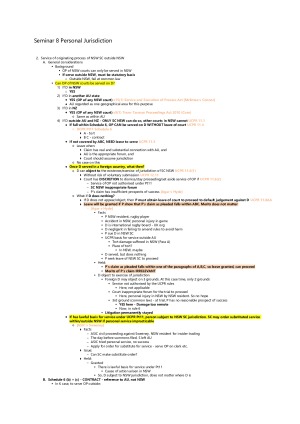 Topic: Scope of Private International Law Choice of Law in Tort Personal Jurisdiction Substance and Procedure Proof of foreign law Exclusionary Doctrines Choice of Law in Contract Foreign Judgements These Private A notes combines material from lectures and readings. The structure and logic is very clear for each topic thus easy to follow. A detailed account of principles is contained in these notes, as well as key cases and statutes. Cases summaries include facts, decision and principles. For important cases, I have also included a one-sentence summary which is very useful in exams.
